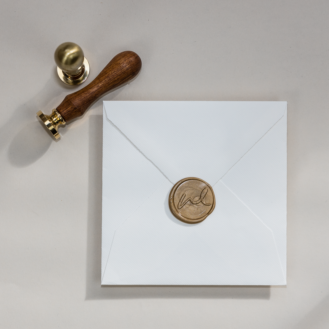 Een met messing gegraveerde lakstempel met handvat, gepersonaliseerd met jouw (bedrijfs)logo. Met een lakstempel met je eigen logo geef jij jou (bedrijfs)stationery een elegante en luxe uitstraling!